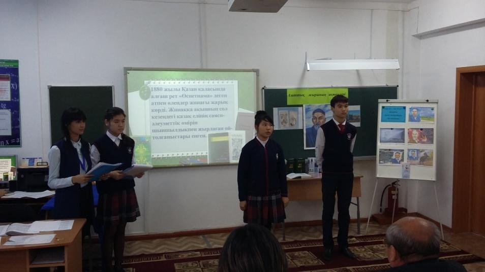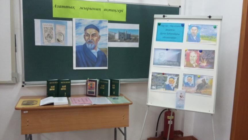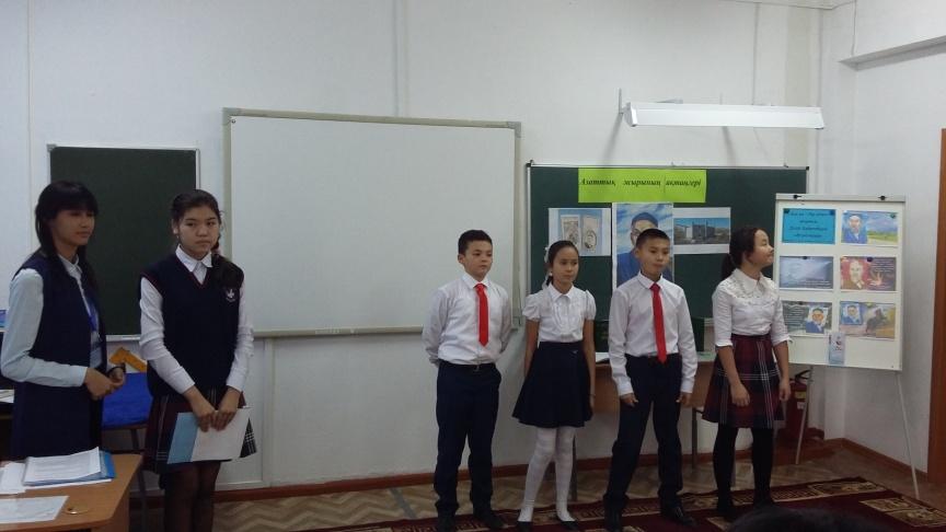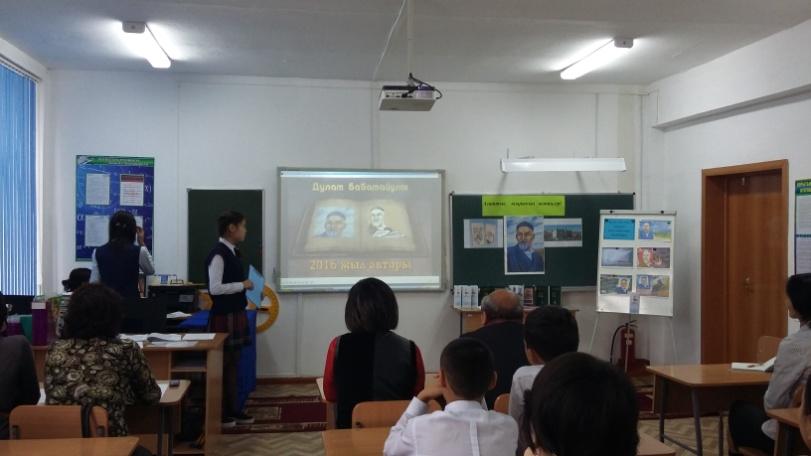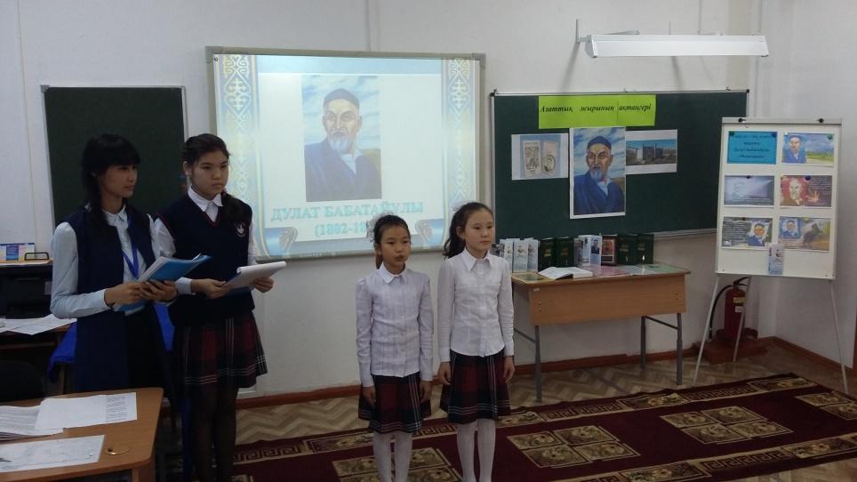 | Қойылым(атасы мен немересінің әңгімесі): Атасы -Смагулов Асхат 9 «А», Немересі - Сайлаубев Мейрхат 6 «Ә» сынып оқушылары Шығарма жаза алмай қиналып отырған 7-сынып оқушысы. Теледидар көріп отырған атасы, қолында газет. Теледидардан дауыс естіледі: Д. Бабатайұлы «Аягөз, қайда барасың?» (Сакенова Альмира 7 «Ә», Әбікен Нұрила 7 «Ә» сынып оқушшылары) өлеңі оқылады: Тауды екіге жарасың, Тастың қашап арасын. Кесіп өтіп кезеңді, Аягөз, қайда барасың?.. Немересі қаламын тастай сала атасының қасына келіп: Немересі: - Мен бұл өлеңді білемін, ата! Кеше ғана Әдебиет сабағынан өткен болатынбыз. Дулат Бабатайұлының өлеңі. Атасы: - «Сорғалаған нөсердей, Жырын тыңда, Дулаттың...»(немересіне жақындай түсіп). Иә, балам, бұл – Дулаттың жазған өлеңі. ХІХ ғасырдың алғашқы жартысындағы туған елінің тарихи бір кезеңін жырлаған. Сен біледі екенсің. Ендеше Дулаттың кім екенін білетін шығарсың. Немересі: Атасы: Сын сәттерде халқын адастырмай ақ жолға бастайтын, бағыт беріп, бағдар көрсететін Темірқазық сынды бітімі бөлек, тұғыры тиянақты алып тұлғалар болады. Қазақ үшін осындай өрелілік өлшемі, биіктік мұнарасы – ХІХ ғасырдың ғажайып өкілі, от тілді, орақ ауызды жыр тұлпары – Дулат Бабатайұлы Немересі: Атасы: Немересі: Атасы: Жүр, балам. Мен сені бір жақсы кешке алып барайын. Дәл сол Дулат атаң туралы, жүре ғой (Ертіп алып, шығып кетеді)