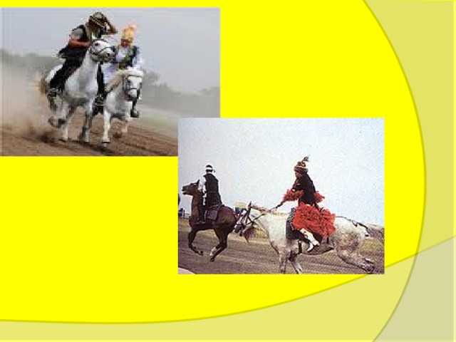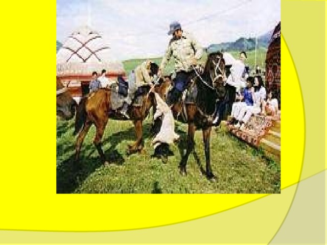 Кыз-куу. У парня же задача противоположная: он должен настигнуть и поцеловать девушку, прежде чем она доедет до отмеченной территории. Если юноша её не догоняет, то он разворачивается назад и скачет обратно. Если же девушка догонит парня, то она стегает его камчой. Очень зрелищное представление!