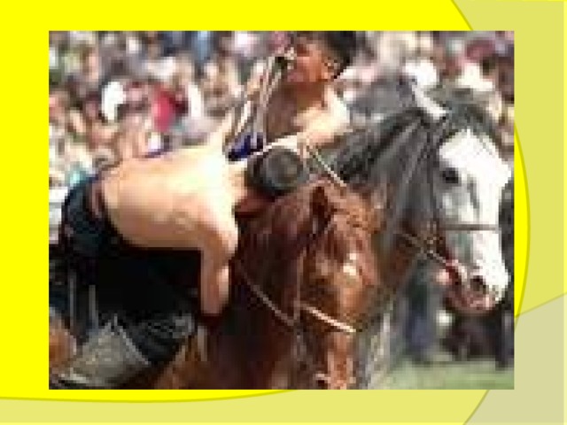 Борьба на лошадях - одна из самых напряженных, зрелищных и любимых казахских игр. Побеждает тот, кто смог побороть своего противника и стащить его с коня. В этом состязании нужно проявить не только силу и ловкость, но и умение удержаться в седле в самых сложных ситуациях.