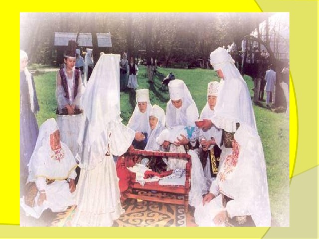 Когда ребенка впервые укладывают в колыбель, проводится обряд "бесікке салу" ("укладывание в колыбель"). Право осуществить такую ответственную миссию поручается, как правило, специально приглашенной мудрой и уважаемой бабушке, имеющей многочисленное потомство.
