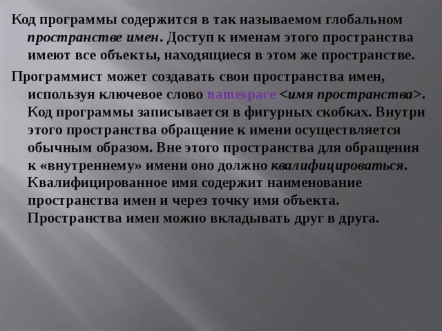 . Код программы записывается в фигурных скобках. Внутри этого пространства обращение к имени осуществляется обычным образом. Вне этого пространства для обращения к «внутреннему» имени оно должно квалифицироваться . Квалифицированное имя содержит наименование пространства имен и через точку имя объекта. Пространства имен можно вкладывать друг в друга. " width="640"
