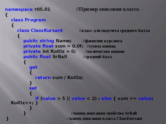 5 || value else { sum += value ; KolOz++; } } } //конец описания свойства SrBall } //конец описания класса ClassKursant " width="640"