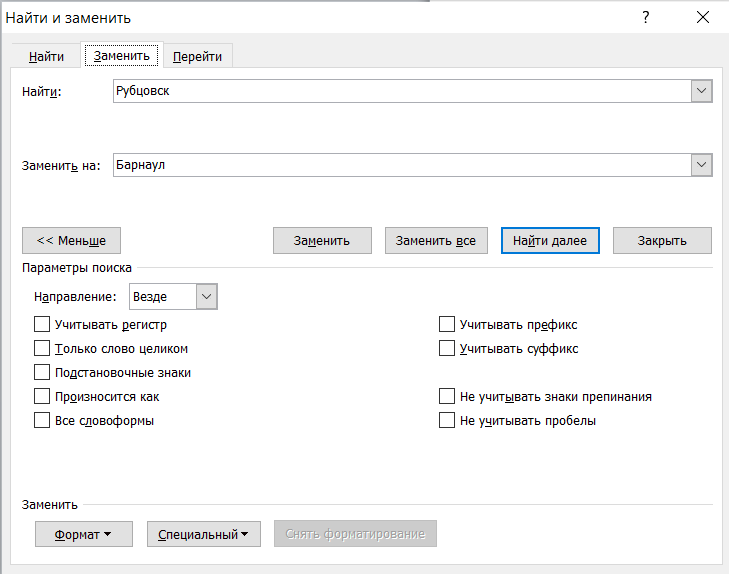 Кнопка «Заменить все» позволяет искать все вхождения образца из поля