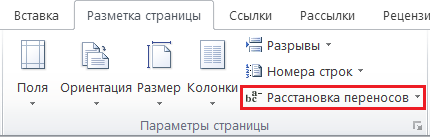Включение режима автоматического переноса слов выполняется командой ленты «Расстановка переносов» в группе «Параметры страницы» на вкладке «Разметка страницы» (рисунок 1.9).