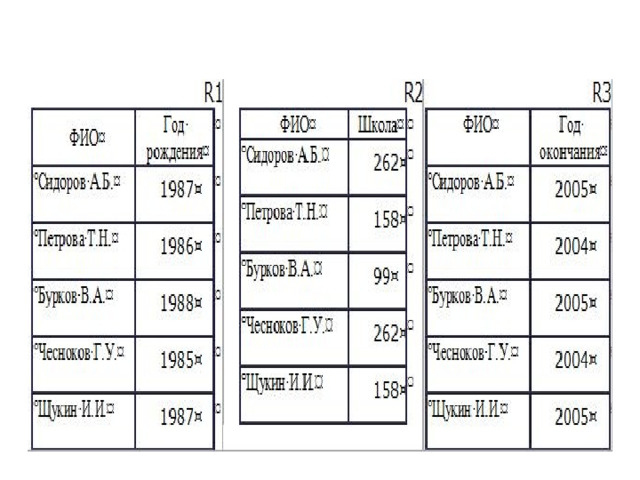 Пусть даны 3 отношения: R1,R2,R3. В первом отношении пусть содержится список абитуриентов и год их рождения, во втором так же список абитуриентов и номер школы, которую они закончили. В третьем отношении находится список абитуриентов с указанием года окончания школы.