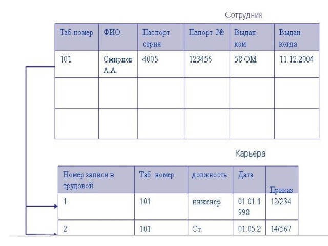 В отношении «Сотрудник» атрибут «Таб. номер» является первичным ключом (PRIMARY KEY). В отношении «Карьера» атрибут «Таб. номер» является внешним ключом (FOREIGN KEY), а первичным ключом отношения «Карьера» будет набор атрибутов «Номер записи в трудовой книжке», «Таб. номер». В общем случае отношение может выступать в роли основного по отношению к другому и в роли подчиненного к некоторому третьему отношению. Одно отношение может быть подчинено сразу нескольким основным отношениям, в этом случае в нем присутствуют сразу несколько внешних ключей, а вот первичный ключ отношения всегда только один