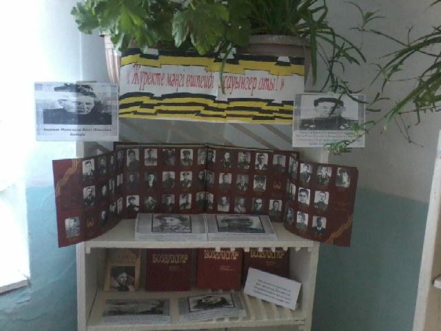 Мамыр айында «Ел бірлігі ең асыл қасиет», «Соғыстан шыққан кітаптар» көрме ұйымдастырылды, ерлік көрсеткен халық қаһармандарының кітаптары қойылды, яғни Қасым Қайсеновтың, Бауыржан Момышұлы, Қасым Аманжоловтың. Оқушылар кітапханаға үнемі келіп, жан- жақты саладағы пәндерден рефераттар жазып сабаққа дайындалады.