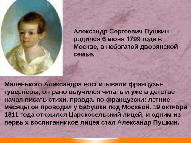 Родился в Москве в дворянской семье. Родители с самого детства развивали любовь к чтению. Бабушка учила письму. Няня Арина Родионовна привила любовь к русской песне, сказкам.
