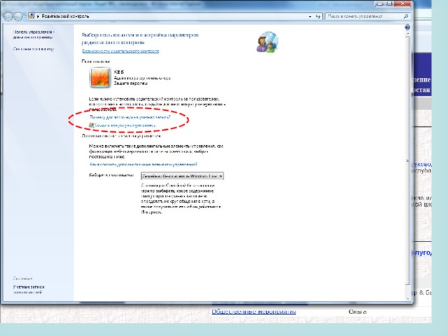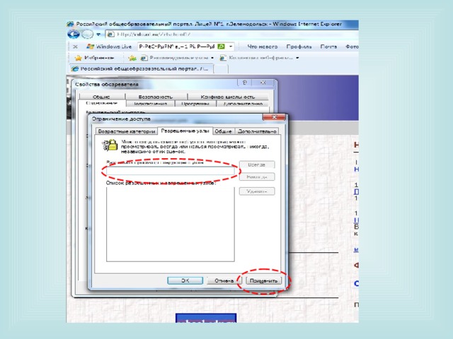 3) Существует вариант контентной фильтрации, встроенный в браузер Internet Explorer на вкладке Сервис → Свойства обозревателя → Содержание → Ограничение доступа к информации, получаемой из Интернета → Включить… и Родительский контроль, настроить который можно, следуя инструкциям, прописанным в браузере или перейдя по ссылкам на видеоинструкцию компании windows http :// windows . microsoft . com / ru - RU / windows 7/ help / videos / using - parental - controls /. Однако при этом создаётся проблема запроса пароля на любой Интернет-ресурс, не прописанный в разделе разрешённых.