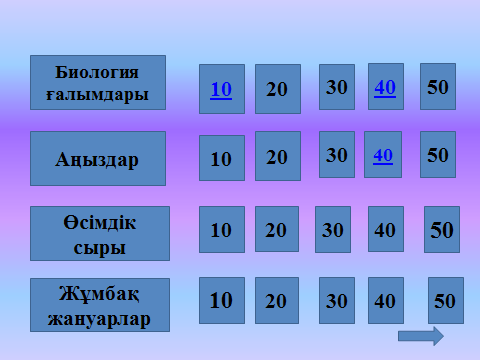 Мақсаты: оқушылардың биология пәнінен білгірліктерін анықтап, пәнге қызығушылығын арттыру.