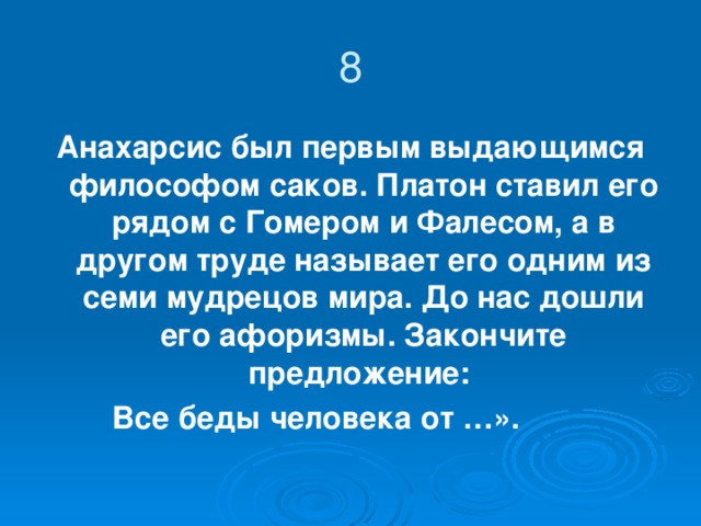Анахарсис был первым выдающимся философом саков. Платон ставил его рядом с Гомером и Фалесом, а в другом труде называет его одним из семи мудрецов мира. До нас дошли его афоризмы. Закончите предложение: