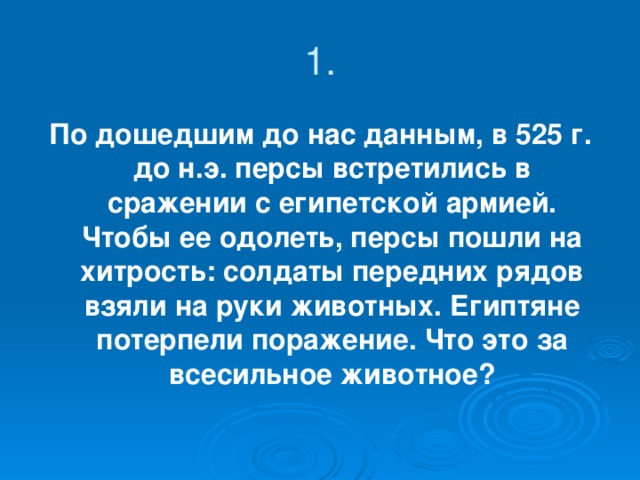 По дошедшим до нас данным, в 525 г. до н.э. персы встретились в сражении с египетской армией. Чтобы ее одолеть, персы пошли на хитрость: солдаты передних рядов взяли на руки животных. Египтяне потерпели поражение. Что это за всесильное животное?