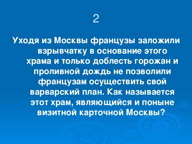 Уходя из Москвы французы заложили взрывчатку в основание этого храма и только доблесть горожан и проливной дождь не позволили французам осуществить свой варварский план. Как называется этот храм, являющийся и поныне визитной карточной Москвы?