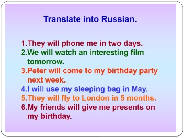 1. Она будет занята. (to be busy) 2. Я не буду занят. 3. Вы будете заняты? 4. Они будут дома? (to be at home) 5. Его не будет дома. 6. Я не буду знать. 7. Они будут знать? 8. Она не будет знать. 9. Кто будет знать? 10. Никто не будет знать. 11. Он будет читать английские книги? (to read English books) 12. Они никогда не будут читать. (never / to read) 13. У неё будет квартира? (to have a flat) 14. У него ничего не будет. 15. Кто это будет?