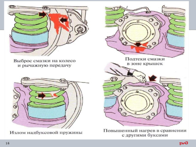 - выброс смазки из лабиринтной части роликовой буксы на центр обода колеса или на нижнюю часть рамы вагона;