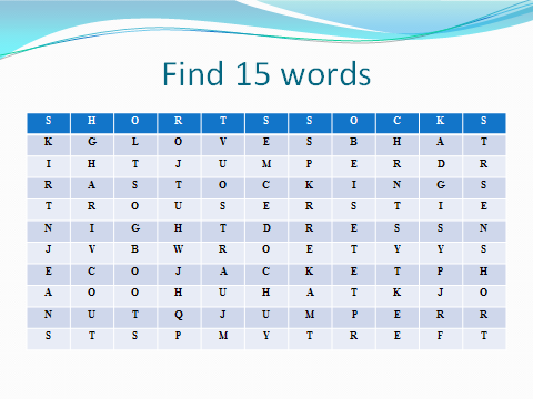 Educational: to learn names of clothes, to practice using it in different exercise ; to enrich pupils’ vocabulary in English;