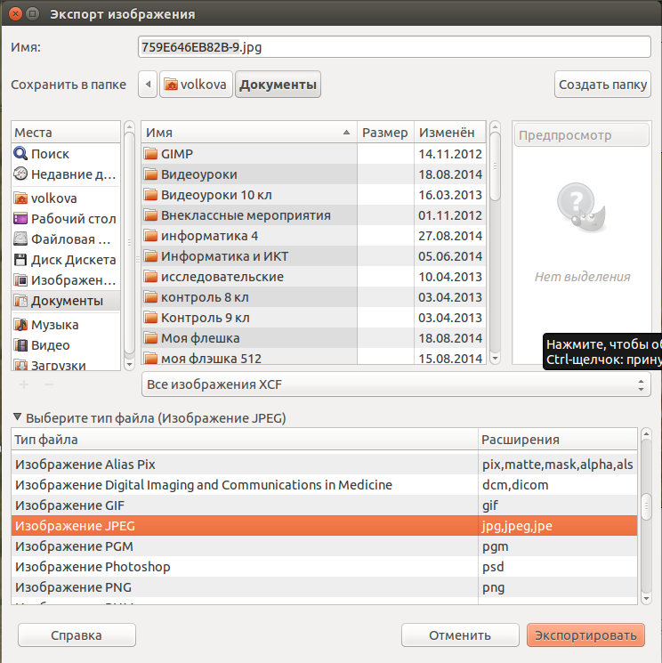 Сохраните файл под именем «Грибы» в папке «Работы» с расширением JPEG. Выполните команду: Файл/ Сохранить как (в версии Gimp 2.8 команда Файл/ Export As...). В появившемся окне выберите место сохранения (папку) и введите имя файла. Для выбора формата файла нужно нажать на ниспадающий список Выберите тип файла (по расширению) и выбрать JPEG. Затем нажмите кнопку Сохранить (Экспортировать).