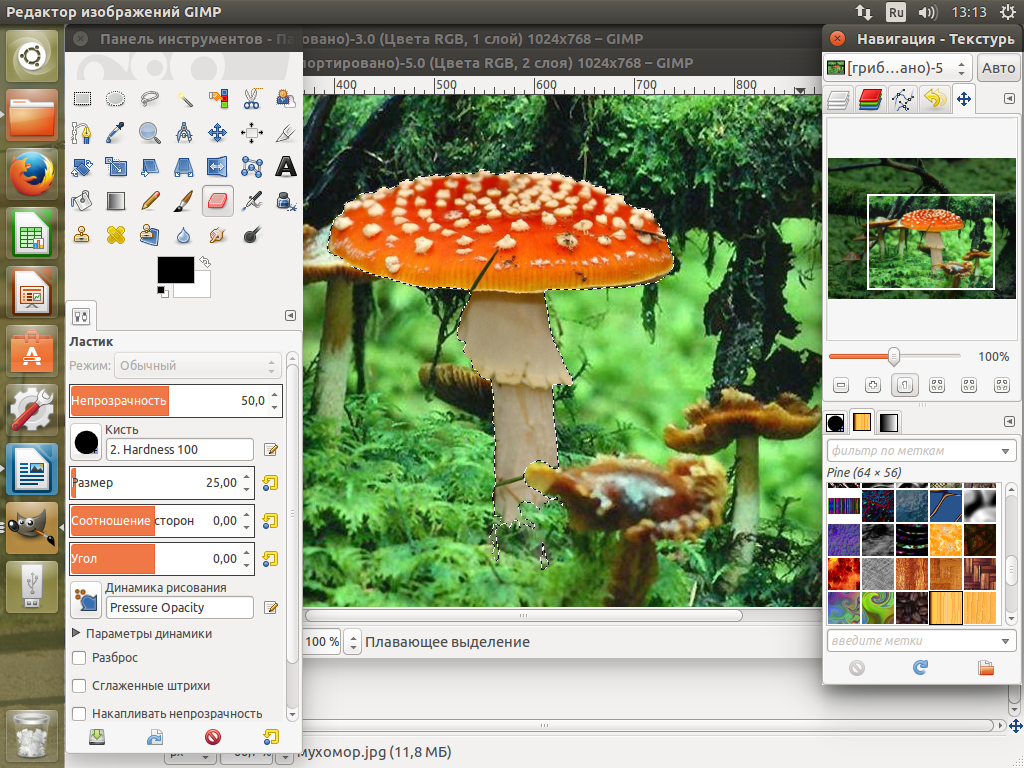 Аккуратно закрашиваем гриб кистью (при этом полупрозрачное красное выделение исчезает). Для более точного закрашивания изображение можно увеличить (используйте панель навигации) и изменить размер кисти.