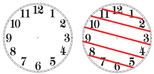 Пятью прямыми линиями разделите циферблат так, чтобы в каждой части числа при сложении давали бы равную сумму.