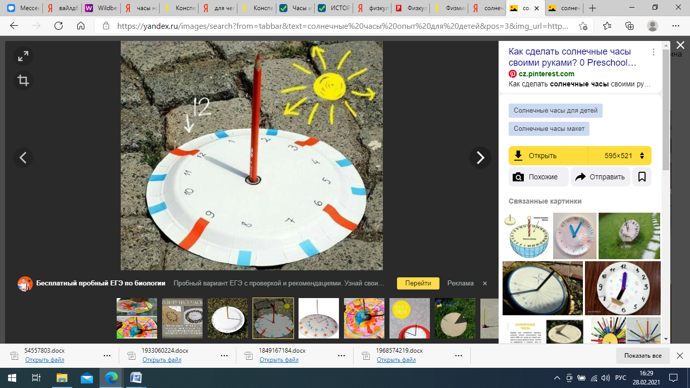 | Основная часть | Сегодня мы с вами отправимся в прошлое, для этого нам нужна машина времени, но, к сожалению, ее не успели собрать, давайте с вами соберем детали машины, но для этого вам нужно будет решать примеры. За каждый правильно решенный пример на слайде будет появляться деталь нашей с вами машины времени. Примеры: 9+1= 12-3= 5+6= 7+8= 15-1= 3+14= 17-5= 20-17= Молодцы, ребята, посмотрите, какая необычная машина времени у нас с вами получилась. Сейчас мы с вами отправимся в прошлое и узнаем, когда люди и как научились определять время. Но для начала мы должны узнать, что же такое время? Как вы понимаете это слово? -В современном мире очень важно знать, что такое время. Отправление поездов, вылет самолетов, начало рабочего дня, занятий в школах, спортивных соревнований и передач по телевидению - все это происходит в точно назначенный час. ВРЕМЯ, понятие, позволяющее установить, когда произошло, то или иное событие. В русском языке мы тоже можем найти немало выражений с этим словом. Какие знаете вы? Теперь, мы можем лететь в прошлое. Давным-давно, когда еще не было часов, люди узнавали время по солнцу. Взошло солнце – пора вставать, темнеет – пора спать. Но однажды люди заметили, что тени от всех предметов движутся по кругу, становятся длиннее и короче, в зависимости от положения солнца на небе. Так человек придумал солнечные часы - самые древние часы. Родина этих часов - Вавилон. Циферблат часов устанавливался на открытое, хорошо освещенное солнцем пространство. Вместо стрелки ставили в серединке стерженёк, который отбрасывал тень. Солнце всходило, и тень от стерженька начинала двигаться вокруг него. Но был у этих часов один недостаток. - Как вы думаете какой? Правильно, часы были всем хороши, но без солнца они не работали. Сейчас предлагаю вам провести небольшой опыт, благодаря этому опыту, вы узнаете, как работали солнечные часы. Подойдите тихо и аккуратно к первой парте, встаньте так, чтобы всем было видно. Смотрите, какие у нас с вами получились солнечные часы, теперь по ним можно определять время Тогда люди изобрели водяные часы. Они состояли из двух сосудов, по капелькам вода перетекала из одного сосуда в другой и по тому, сколько вытекло воды, определяли, сколько прошло времени. Такие часы назывались клепсидрами и использовались они очень долго. - Какой же недостаток, по-вашему, был у них? В них нужно было все время подливать воду. - Из древности к нам пришли и другие часы – песочные. Они состояли из 2-х стеклянных конусов, соединенных вместе, внутри был насыпан песок. Объем песка указывал на определенный промежуток времени. Они сохранились до нашего времени: ими до сих пор пользуются в медицине, если нужно отмерить временные отрезки небольшой длины: 1 минуту, 2 минуты, 5 минут. Эти часы были очень точными, но был и у них недостаток. - Как вы думаете какой? Правильно, их нужно постоянно переворачивать. Когда-то были и огневые часы. На свечу наносили деления, в нижнее деление втыкали иголку с привязанным грузом. Свеча догорала до иголки, груз падал. Это означало, что прошел определенный промежуток времени. Безопасны ли были такие часы? Свеча может упасть и случится пожар. Существовали и живые, природные часы. Какие, как вы думаете? - Петух – поет с восходом солнца - Цветы – часы бутоны, которых раскрываются и закрываются с заходом солнца. Есть цветы, которые раскрывают