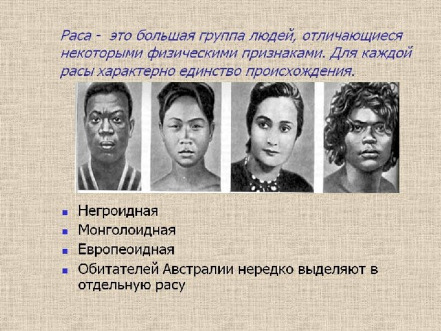 Раса - это большая группа людей, отличающихся некоторыми физическими признаками.