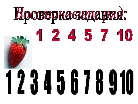 Выходит группа. Находят красную ягодку в классе и выполняют задание. Находят лимон, зеленое яблочко в классе и выполняют задание. 1 группа – Восстановить числовой ряд: 1, 2, 4, 5, 7, 10.