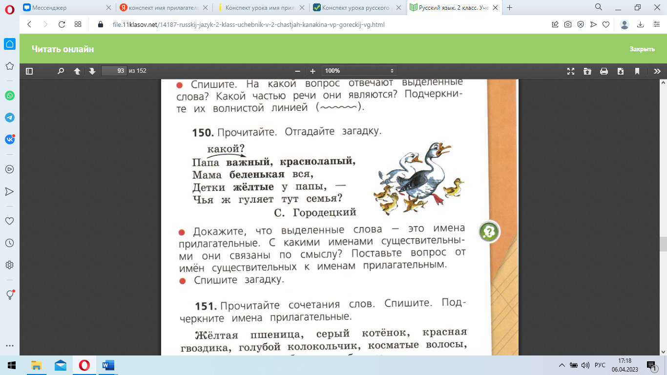 | - научить представлять имени прилагательного как части речи, - учить находить имена прилагательные в тексте, - определять признаки имени прилагательного, - находить и определять орфограммы в тексте. | -развивать умения наблюдать, сравнивать, делать выводы; -развивать умения аргументировать своё мнение; -развивать мыслительную деятельность, познавательную активность, мышление, наблюдательность, внимание, память; -развивать умение давать самооценку своей деятельности; | -воспитывать дисциплинированность, ответственность, способность сопереживать, самоуважение, активность, усидчивость, прилежание, любознательность, заинтересованность в процессе учения; - воспитывать взаимопомощь, взаимовыручку, умение работать в коллективе. | |||