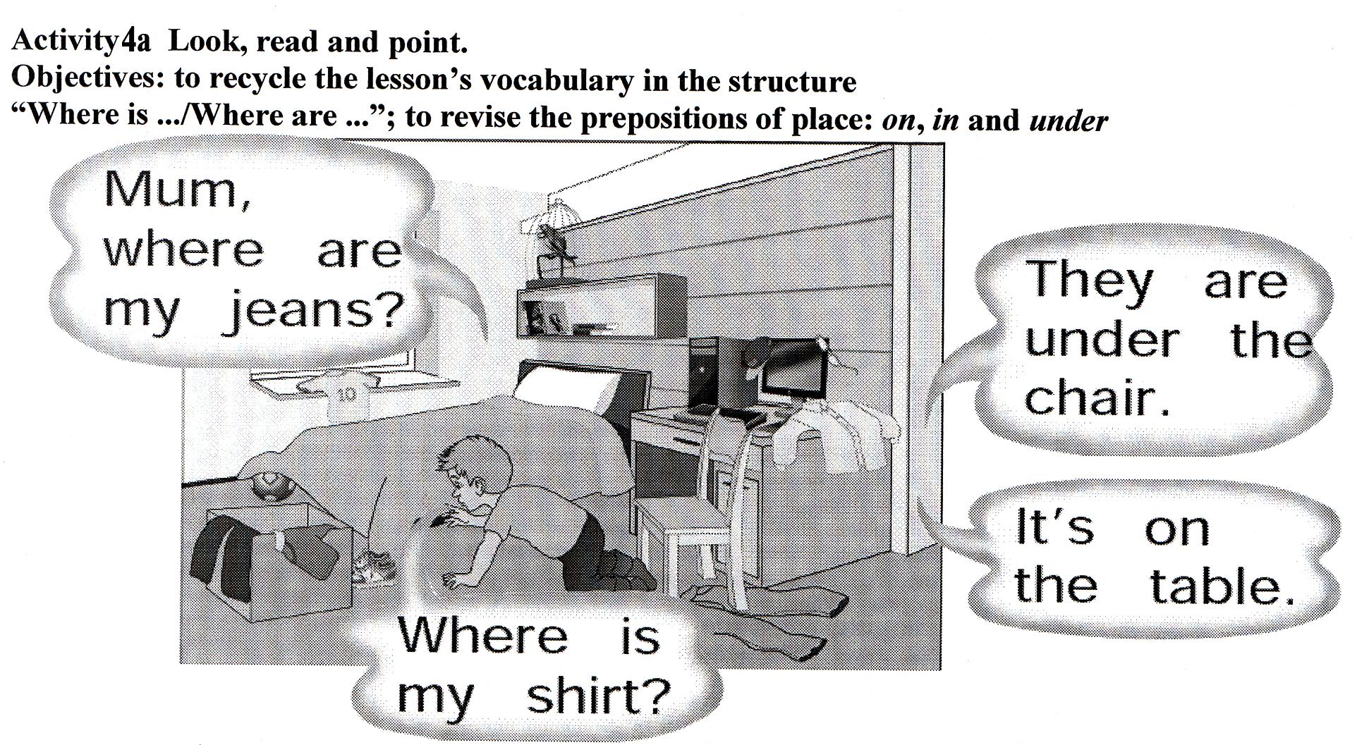 b) developing: to enable the pupils to read for detail; to enable the pupils make sentences using the structure "S/he's got..." to describe people's clothes