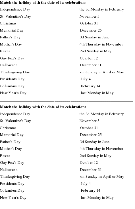 6) Введение материала о праздниках в Великобритании и Америке и датах их проведения.