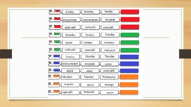 - Monday, Tuesday, Sunday, Zheksenbi , Wednesday
