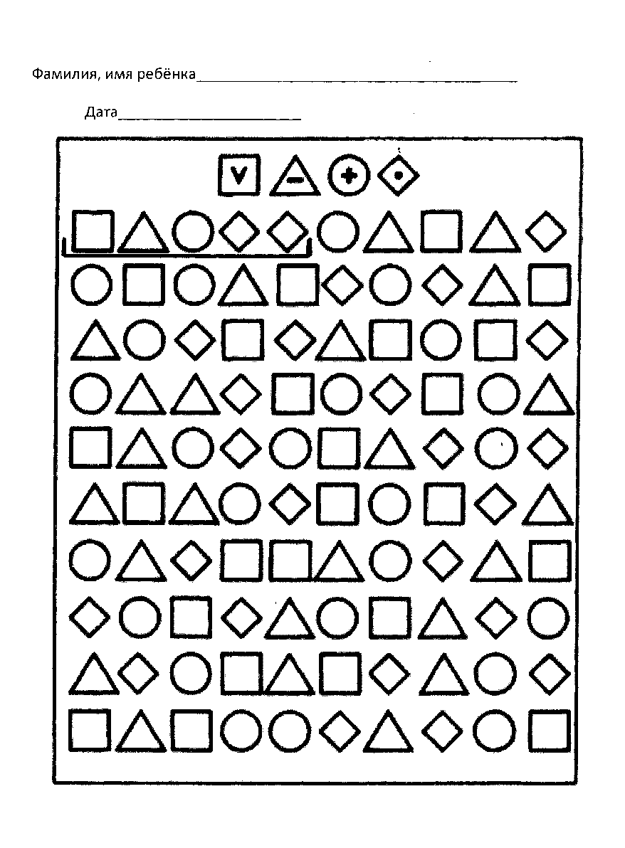 Описание задания: ребёнку предлагается в течение 2 минут осуществить кодирование, поставив в соответствие определённому изображению условный символ. Задание предполагает тренировочный этап (введение инструкции и совместную пробу с психологом). Далее предлагается продолжить выполнение задания, не допуская ошибок и как можно быстрее.