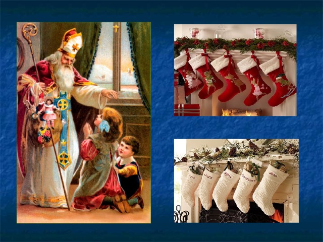 Как гласит легенда, он оставил в приютившей его семье золотые яблоки в башмачке перед камином. Это было о-очень давно, поэтому Святой Николай считается самым первым Дедом Морозом. Он ездит на коне, облаченный в митру и белую епископскую мантию. Его всегда сопровождает слуга-мавр Чёрный Питер, который за спиной несет мешок с подарками для послушных детей, а в руках розги для шалунов.