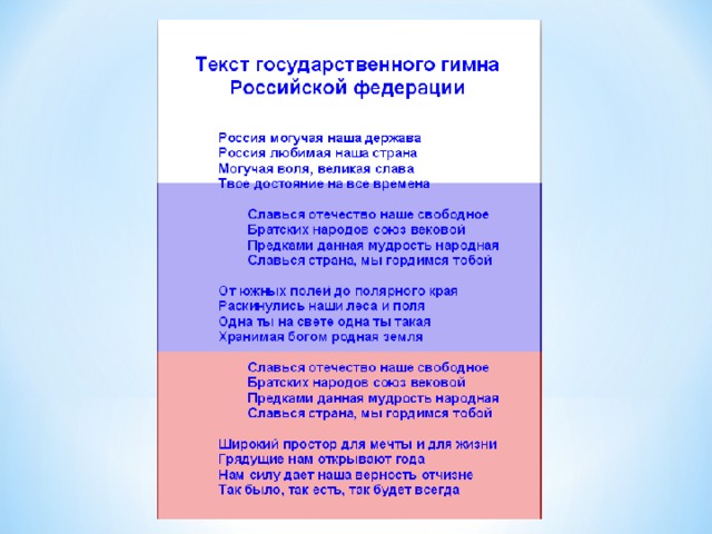 в) торжественная песня или мелодия, исполняемая в особых, торжественных случаях, подчеркивающая любовь к Родине, гордость за нее.