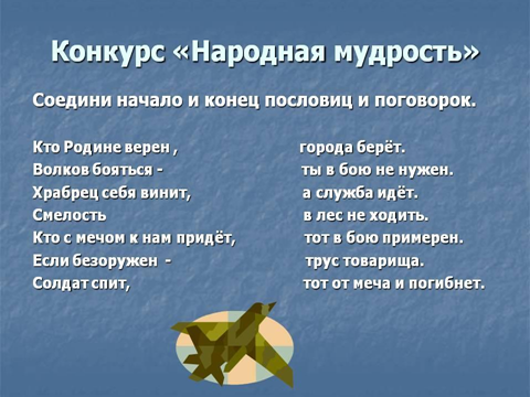 На войне было сложено много пословиц и поговорок бойцами. Давайте их вспомним. Слайд 13