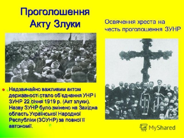 19 жовтня 1918 року було проголошено утворення Західноукраїнської Народної Республіки. Відтоді між урядами УНР і ЗУНР велися переговори про втілення ідеї соборності.