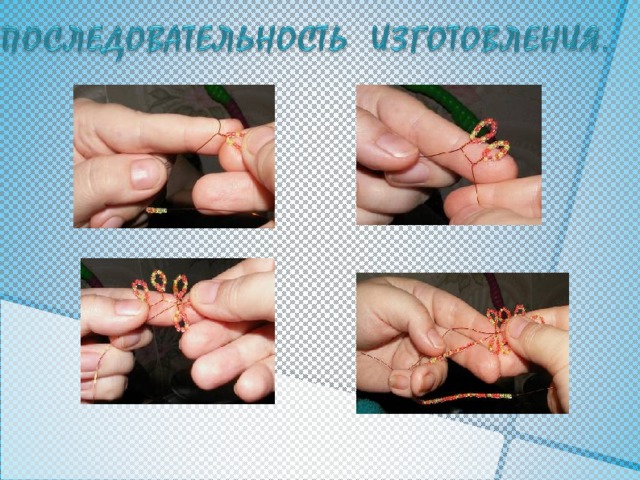 - Научиться применять технологию выполнения изделия из бисера, позволяющую использовать эффект оптического пространственного смещения, то есть получить гамму оттенков