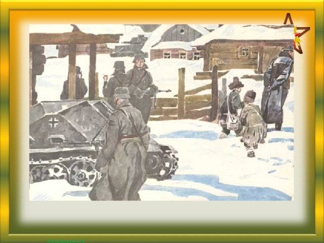 Слайд 13 Когда началась война, и фашисты заняли Лёнино село, он стал сотрудничать с партизанами.