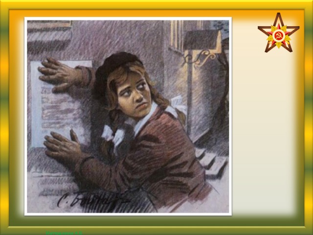 Слайд 24 К нему приходили связные партизан, и каждый раз у дома дежурила Лида. Со стороны поглядеть - играла. А она зорко всматривалась, вслушивалась, не приближаются ли полицаи, патруль, и, если нужно, подавала знак отцу. Опасно? Очень.
