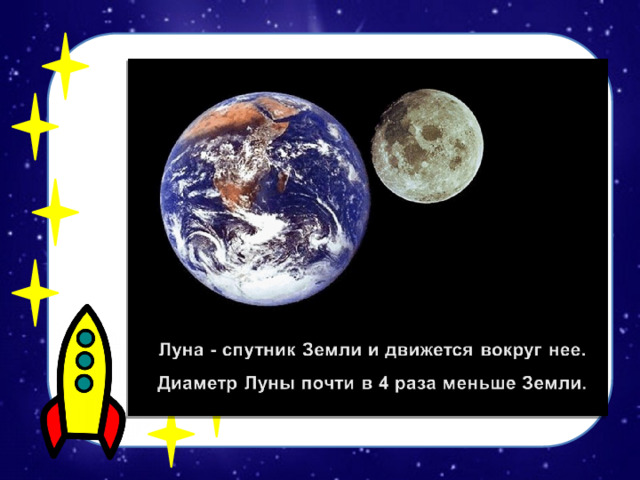 Это –наша планета Земля. Синие пятна на нашей планете – это вода – моря и океаны. Зеленые пятнышки – это зеленые леса и луга. Коричневые пятна – это горы. А маленький кружок около Земли – это Луна, спутник Земли.