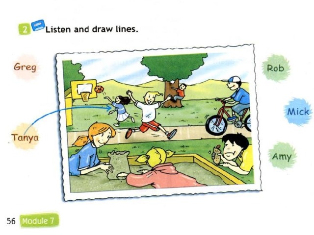 Ребята, на следующей страничке вы увидите картинку. Чтобы выполнить задание, вам необходимо послушать или посмотреть видеофайл. Задание состоит в том, чтобы сказать, как зовут ребят и что они делают. Так как это задание из рабочей тетради, то вам предлагают провести линии от имени к ребёнку. Чтобы вам было проще, попробуйте показать пальчиком ребёнка и его имя, после того, как прослушаете запись. Не бойтесь, если вам покажется сложно! А вот и маленькая подсказка: посмотрите видеофайл внимательно до конца, там вам покажут правильные ответы. Проверьте себя! Если совсем не получается, не беда, это задание только для вас и не на оценку! УДАЧИ!!!