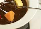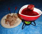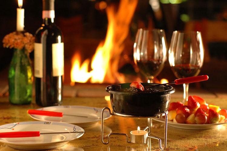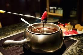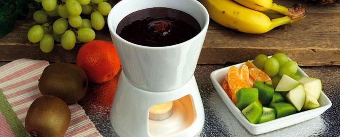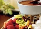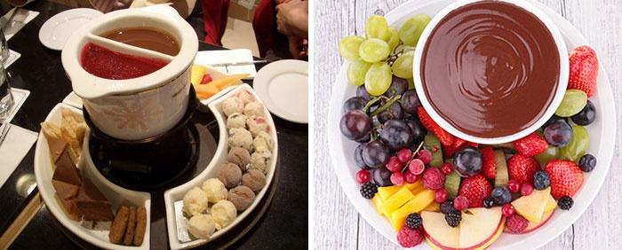 Прекрасным десертом может быть шоколадное фондю. Его готовят в керамической фондюшнице. Шоколад (любой: белый, молочный, горький) растапливают на небольшом огне, часто помешивая. По желанию можно добавить сливки, ликер, коньяк и т. д. В шоколад макают различные фрукты – например, бананы, яблоки, клубнику, а также кусочки печенья, кекса.