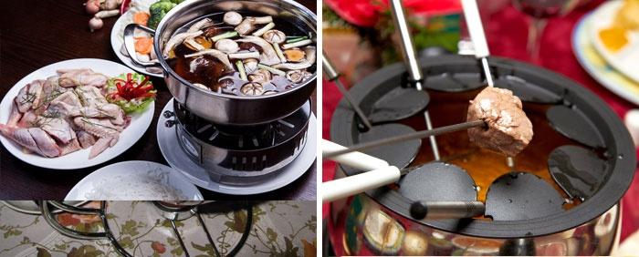 Когда гости сядут за стол, официант приносит чугунок с кипящим растительным, кукурузным или оливковым маслом, ставит на подставку со спиртовой горелкой. Каждый гость самостоятельно накалывает кусочек рыбы или мяса и жарит в течение 2-3 минут, затем вынимает вилку и кладет обжаренный кусочек на свою менажницу, вновь накалывает следующий кусочек и опускает в масло.