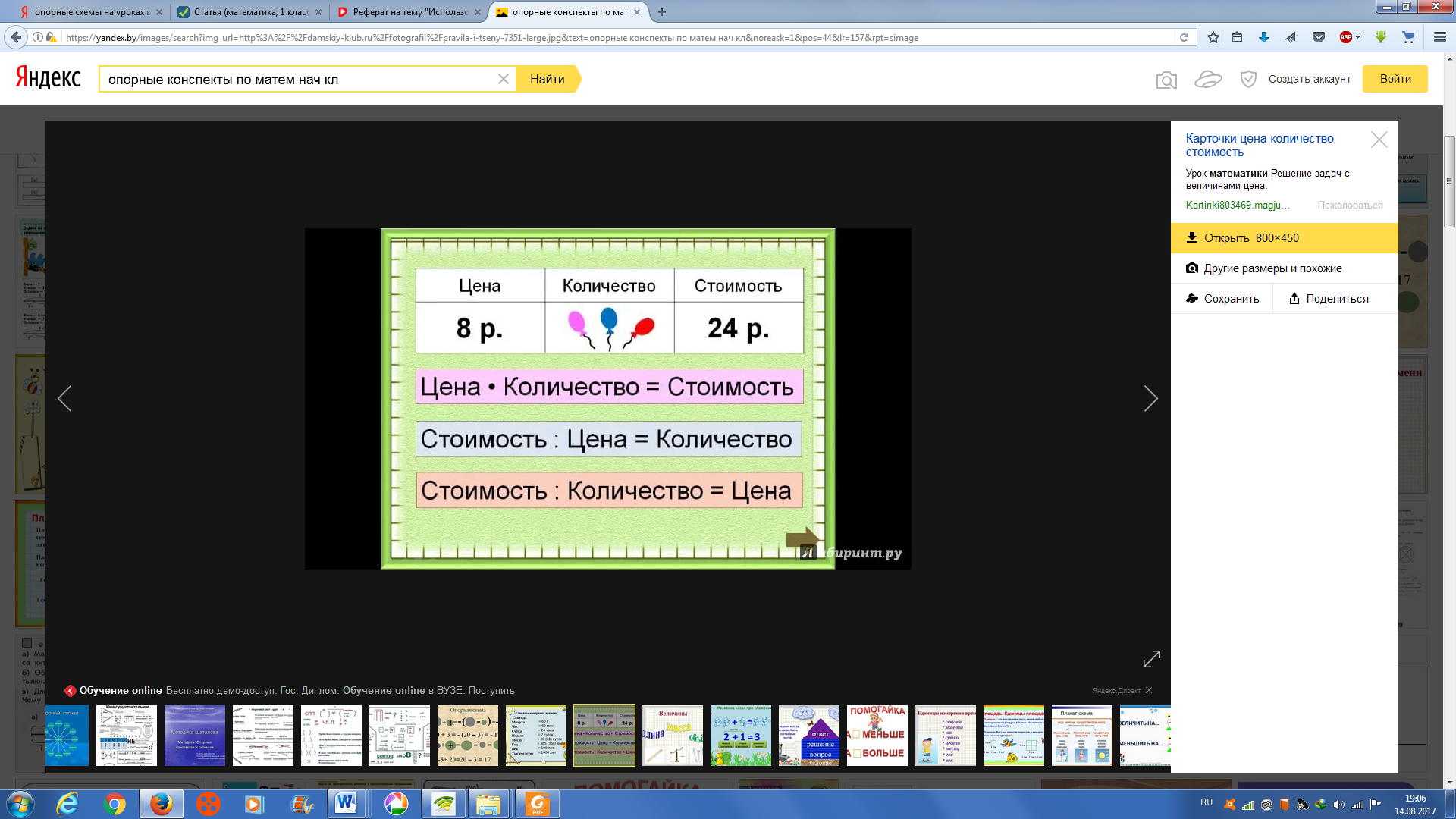При решении более сложных задач также можно применить опорные схемы. Например, при решении задач на понятия цена, количество, стоимость можно применить следующую карточку-схему: