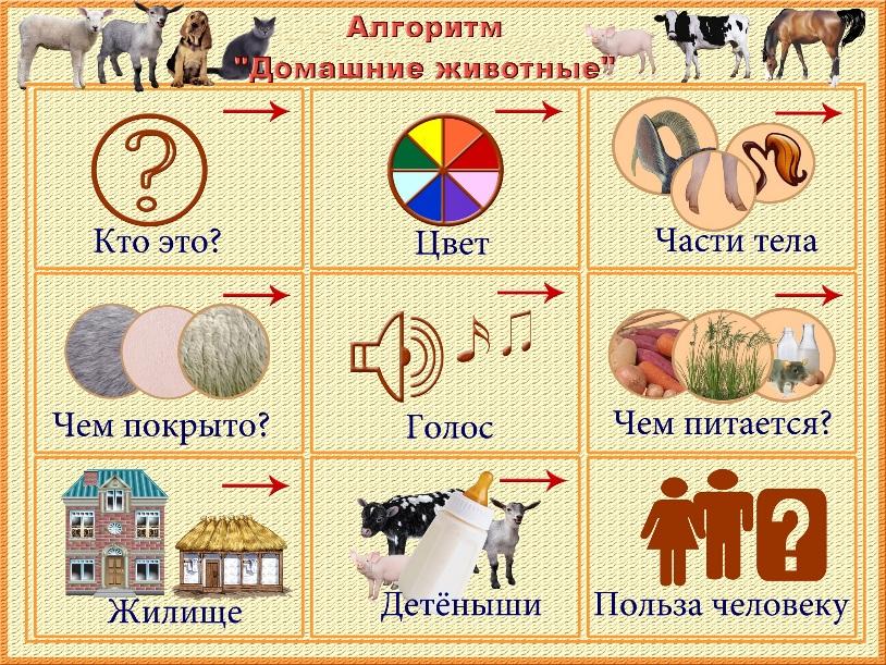 Цель: Расширять знания о домашних животных, о значении домашних животных в жизни человека. Развивать память, речь, воображение. Воспитывать гуманное отношение к животным.