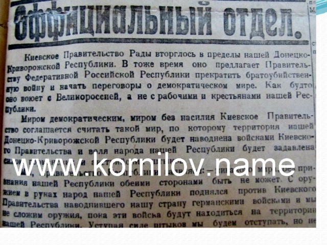 - Правительство УНР в Киеве подписало мир с Германией и пригласило австро-германские войска на Украину для защиты ее от Советской России.
