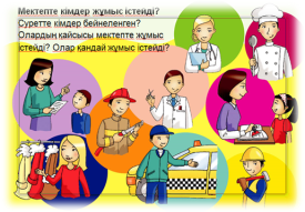 | Сабақтың соңы 15мин | Белсенді оқыту әдісі «Пікір алмасу» 4-тапсырма: Т: Сурет бойынша сұрақтардың жауабын топтаса отырып нақты, түсінікті етіп дәлелдейді. -Мектепте кімдер жұмыс істейді? -Суретте кімдер бейнеленген? -Олардың қайсысы жұмыс істейді? -Олар қандай жұмыс істейді? Бағалау(ауызша): бутерброд әдісі |