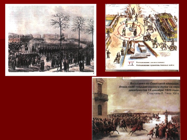 По замыслу декабристов, восставшие войска должны были занять Зимний дворец и Петропавловскую крепость, а царскую семью — арестовать. В это время, как предполагали декабристы, в Петербург съедутся избранные по губерниям депутаты. Самодержавие и крепостничество рухнут. Около 11 часов 14 декабря 1825 года на Сенатскую площадь вышли три полка: лейб-гвардии Московский, лейб-гвардии Гренадерский и Гвардейский морской экипаж. 3000 восставших солдат и 30 офицеров-декабристов построились в каре вокруг памятника Петру Великому. Декабристам не удалось выполнить составленный накануне план. Сенаторы, присягнув Николаю I , уже разъехались.