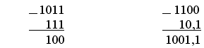 Вычитание многоразрядных двоичных чисел происходит в соответствии с вышеприведённой таблицей вычитания с учетом возможных заёмов из старших разрядов.