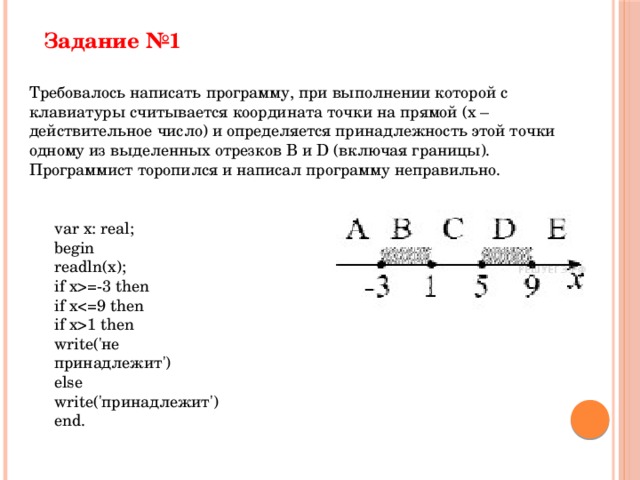 Требовалось написать программу, при выполнении которой с клавиатуры считывается координата точки на прямой (x – действительное число) и определяется принадлежность этой точки одному из выделенных отрезков В и D (включая границы). Программист торопился и написал программу неправильно.