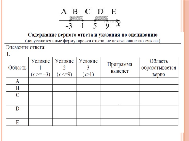 Последовательно выполните следующее. 1 . Перерисуйте и заполните таблицу, которая показывает, как работает программа при аргументах, принадлежащих различным областям (A, B, C, D и E). Границы (точки –3, 1, 5 и 9) принадлежат заштрихованным областям (B и D соответственно).